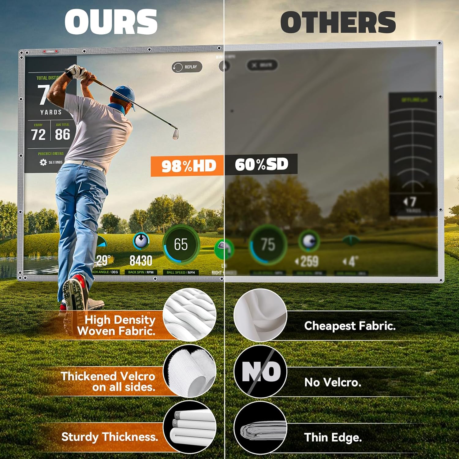 • Upgraded Grommets: Our golf impact screen features stainless steel grommets with a three-hole design. The perimeter includes 32-48 grommet holes, ensuring durability. Additionally, our reinforced Touch fastener border meets diverse installation needs, enhancing longevity and convenience.